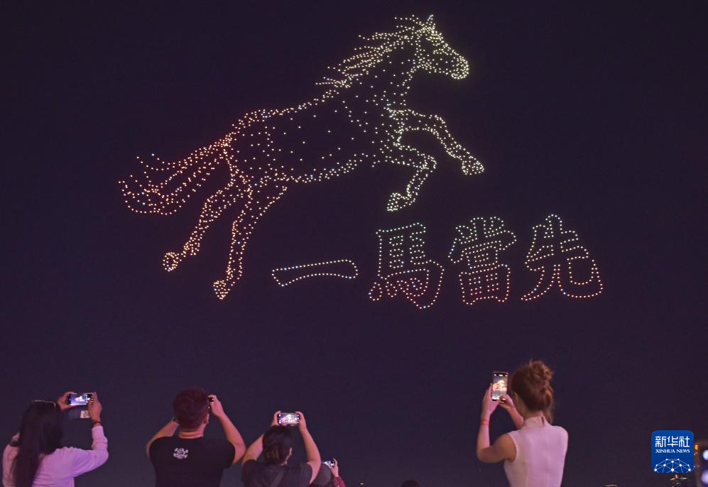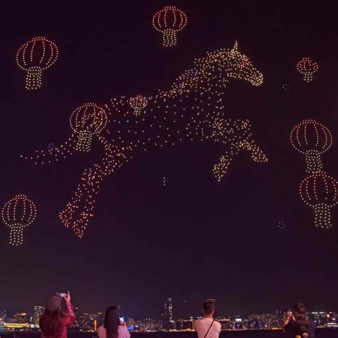 2月14日,由2026架无人机呈现的大型无人机表演在香港湾仔海滨闪亮登场,为即将到来的马年新春增添喜庆祥和的节日气氛。