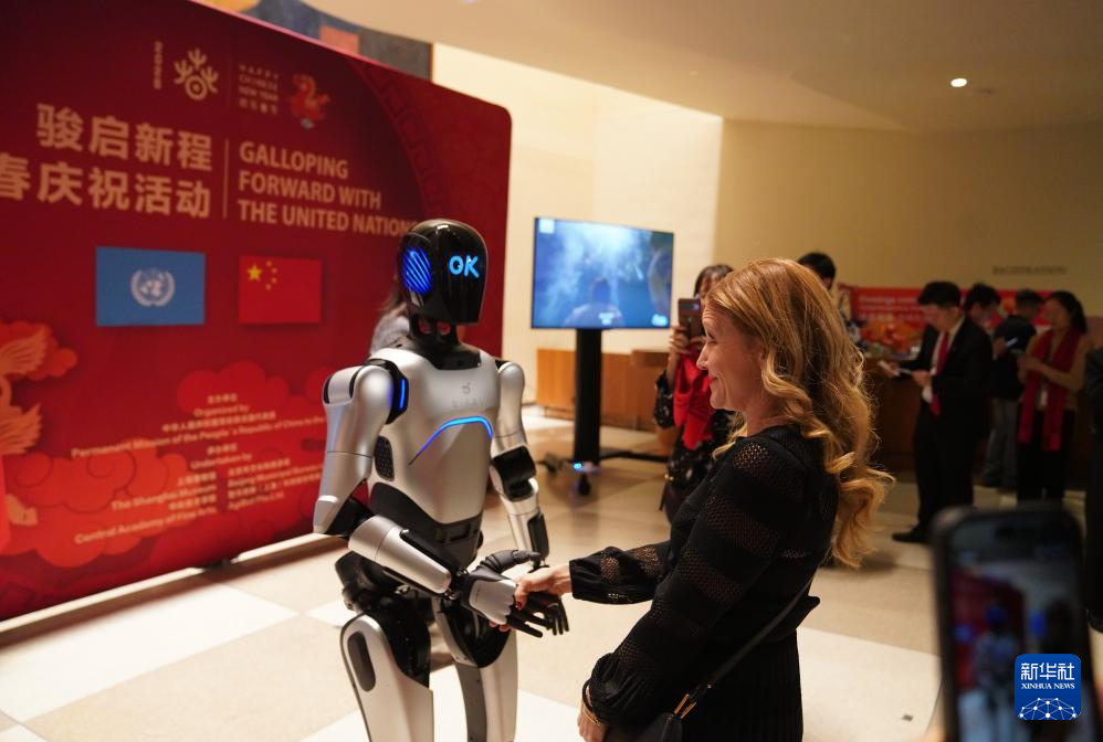 2月9日,在联合国总部举行的“骏启新程”新春庆祝活动上,一名嘉宾和机器人握手。