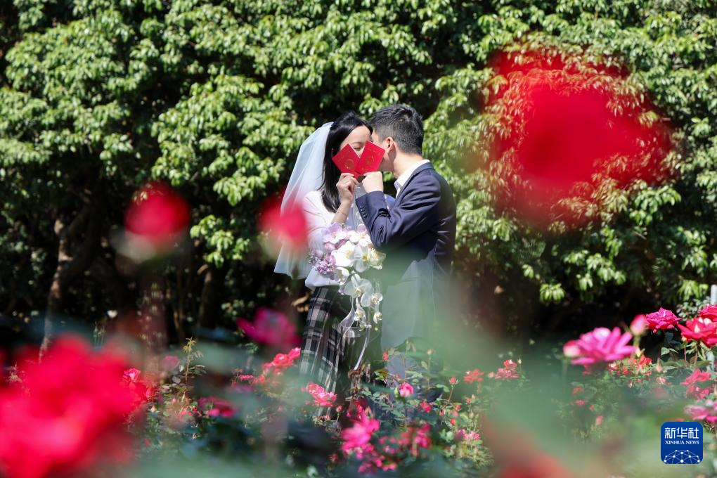 2月14日,在位于深圳市福田区香蜜公园内的婚姻登记处,新人在花园里拍照留念。
