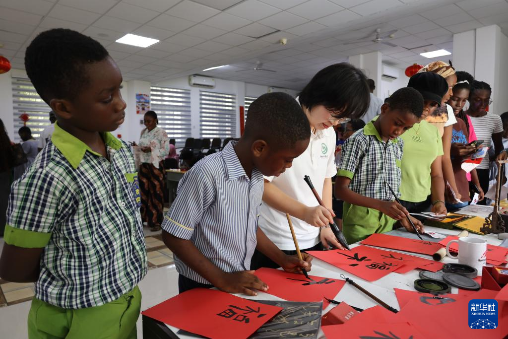2月13日,在加纳阿克拉,学生在加纳大学孔子学院举行的新春游园会上体验书法。