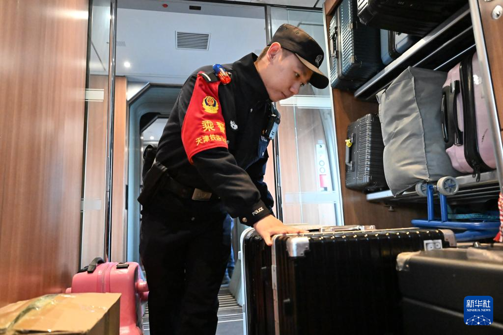 在全长近400米的列车上,天津铁路公安处乘警支队民警潘振东、马键在每一节车厢内来回巡视,提醒旅客看管好随身物品,留意可能错拿的相似行李箱,随时准备处理物品遗失等突发情况;列车员们在各自负责的车厢内帮助旅客安放行李,为老人、孩子和行动不便者提供细致服务;随车机械师王彬每隔半小时查看一次列车运行数据,做好全程记录和应急处理,确保高铁平稳前行;列车长张楠手持电台,时刻与各车厢及沿线车站保持联系,高效处置途中遇到的各种问题。基层班组里的每一个人各司其职,共同护送列车安全准时抵达目的地。