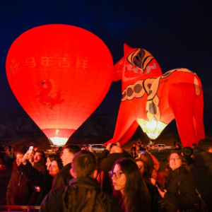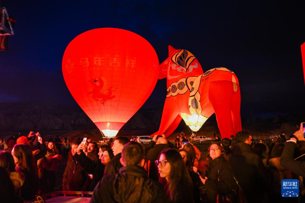 2月14日,在土耳其卡帕多基亚中国春节庆祝活动现场,中国马年主题的热气球正在充气。