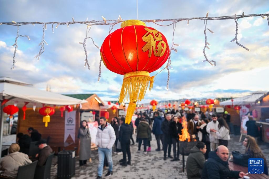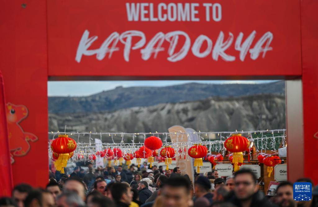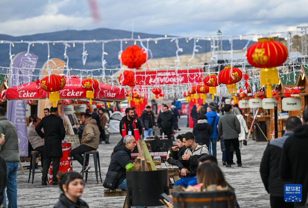 2月14日,在土耳其卡帕多基亚中国春节庆祝活动现场,游客在中国节日气氛浓郁的美食街上游玩。