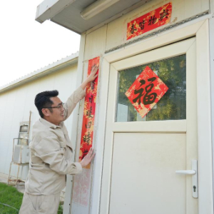 2月15日,在伊拉克瓦西特省艾哈代布油田,一名中方员工在贴春联。
