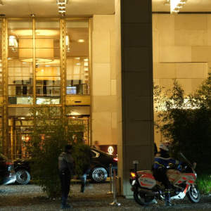 2月17日晚,在瑞士日内瓦,参与俄美乌三方谈判的人员在结束首日会谈后乘车离开会场。