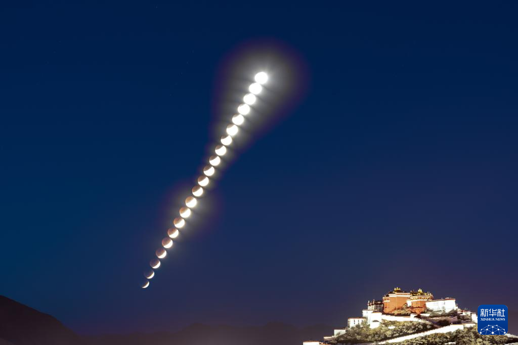 这是3月3日在西藏拉萨拍摄的月全食(堆栈图片)。