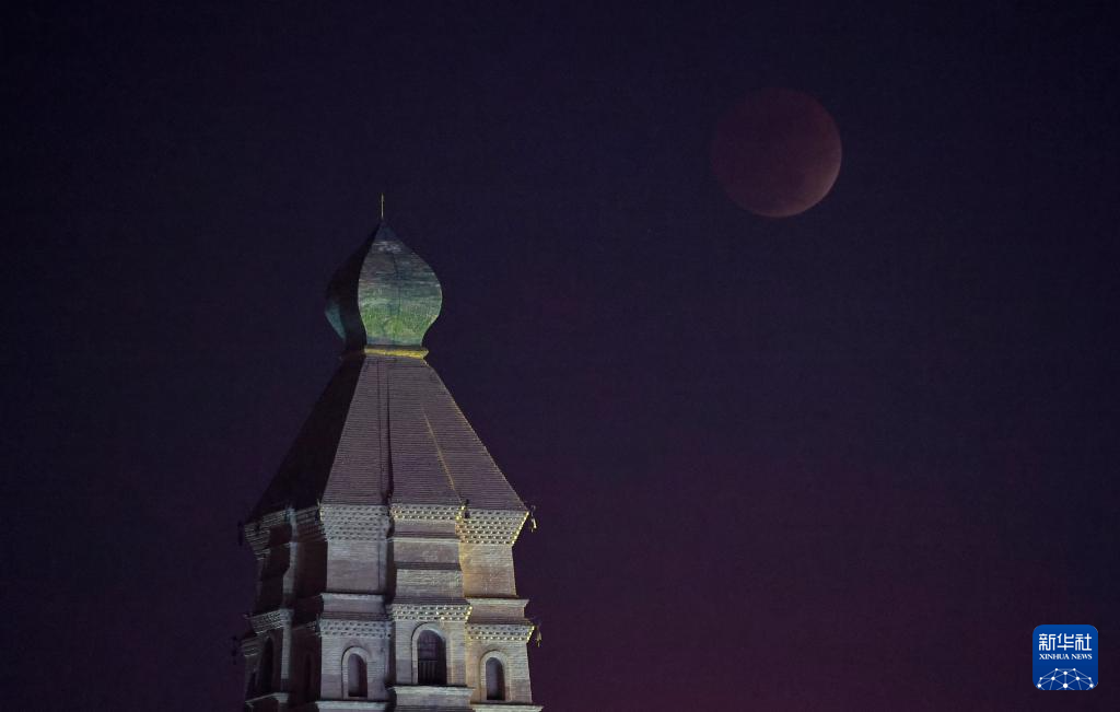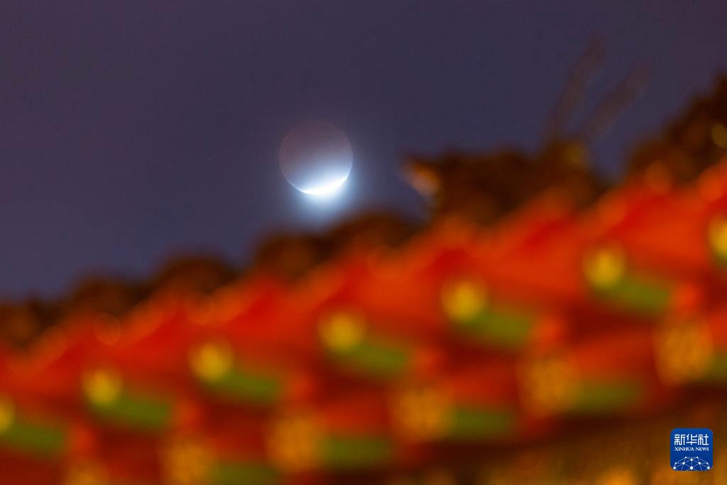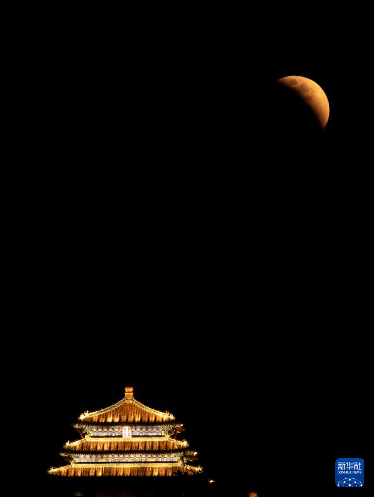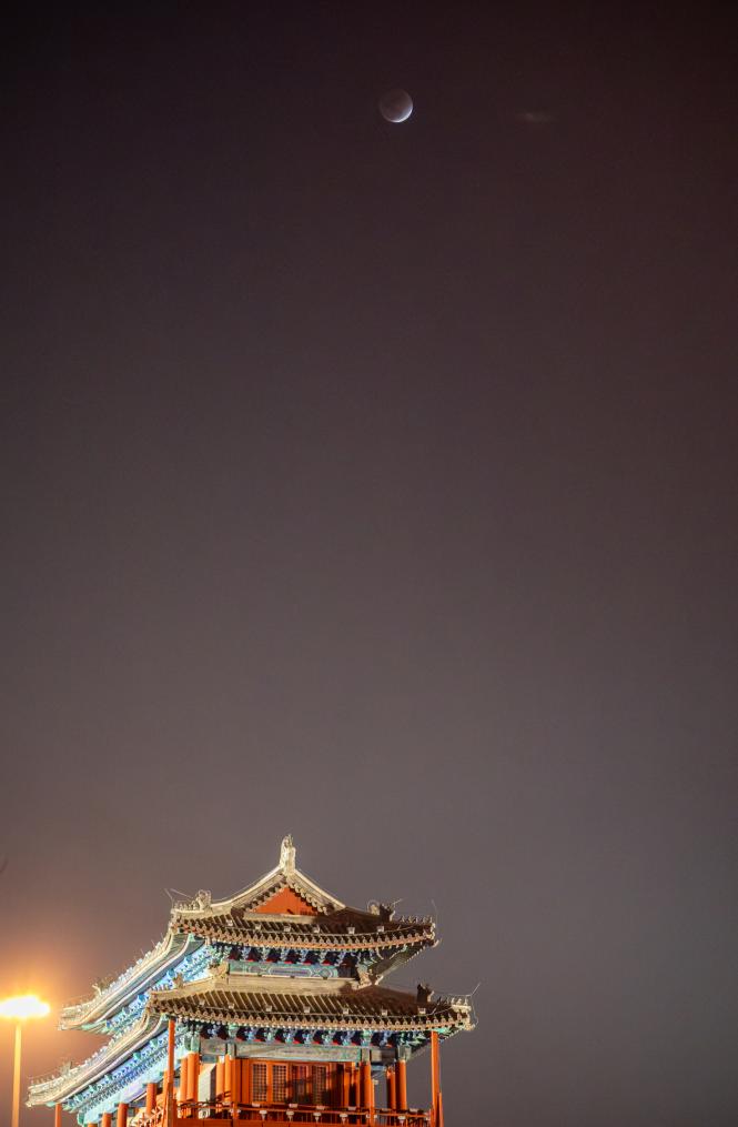 这是3月3日在北京永定门城楼附近拍摄的月全食。