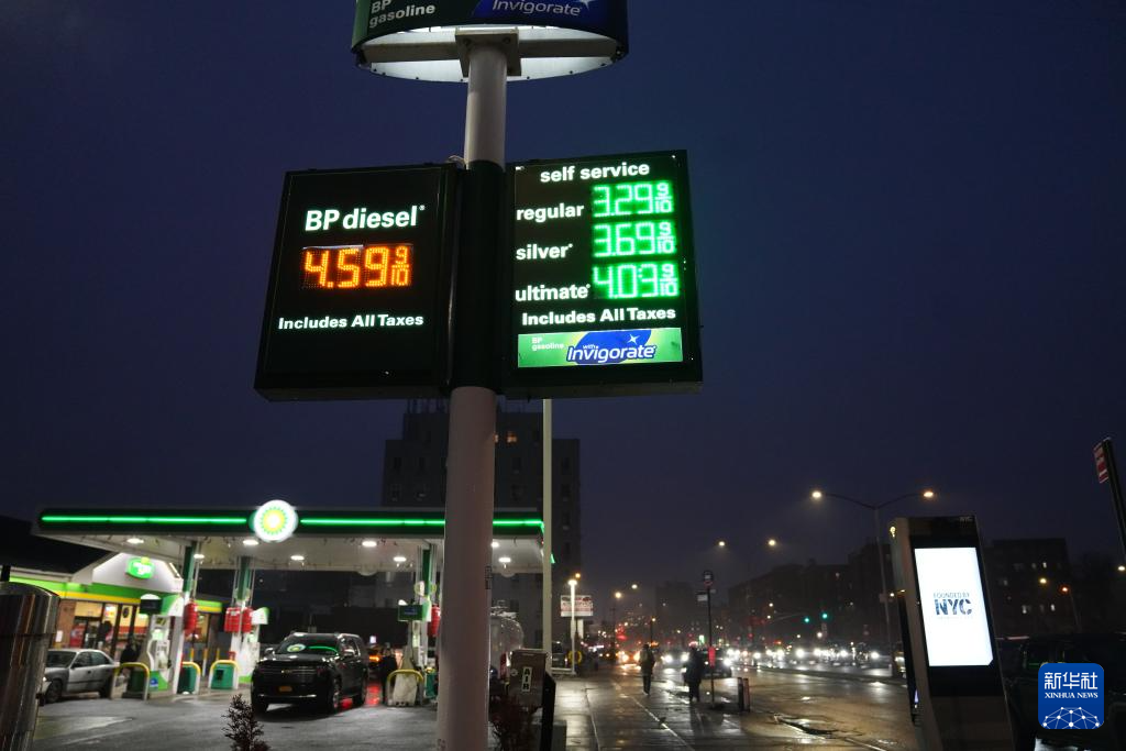 这是3月5日在美国纽约一座加油站拍摄的油价显示屏。