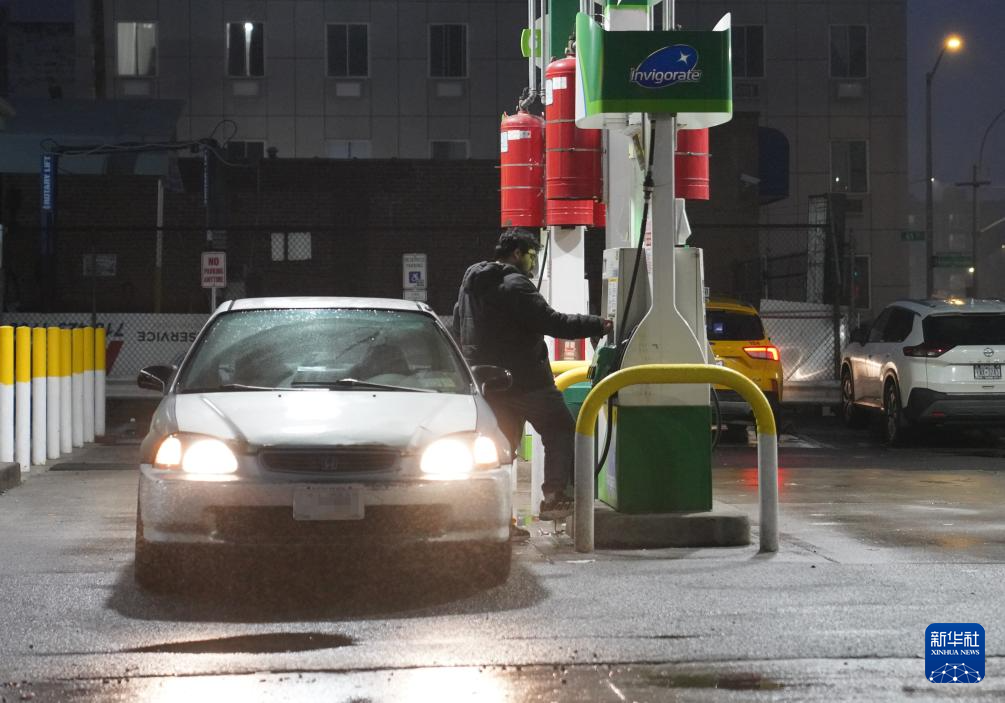 3月5日,在美国纽约一座加油站,一名男子给车加油。
