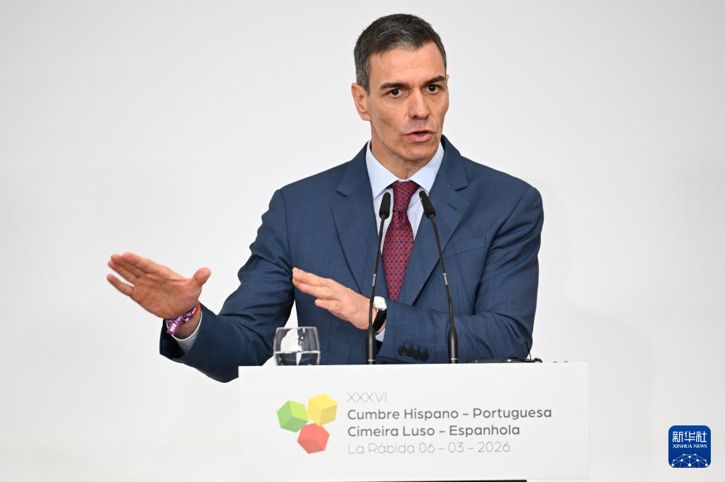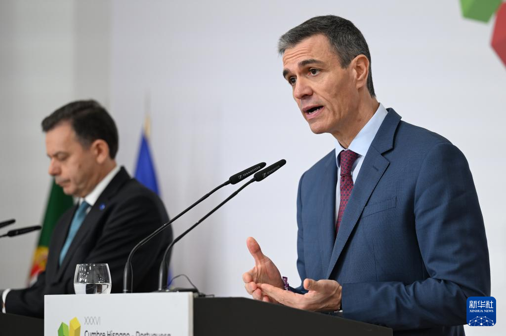 3月6日,在西班牙韦尔瓦省拉拉比达,西班牙首相佩德罗·桑切斯(右)在西班牙-葡萄牙峰会新闻发布会上讲话。