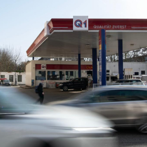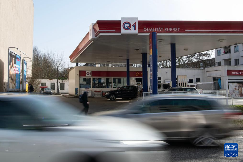 3月9日,车辆驶过德国首都柏林的一座加油站。
