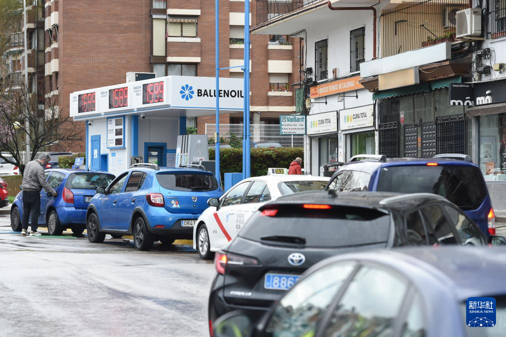 3月9日,车辆在西班牙首都马德里一处加油站排队加油。