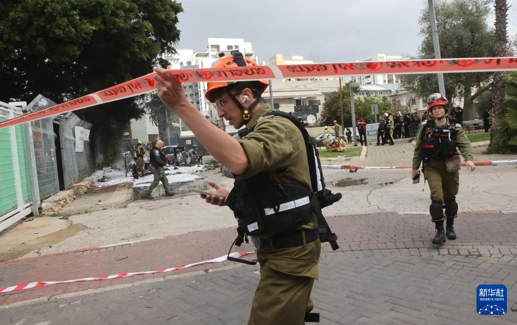 3月15日,安全人员和应急人员在以色列中部城市特拉维夫的导弹袭击现场工作。