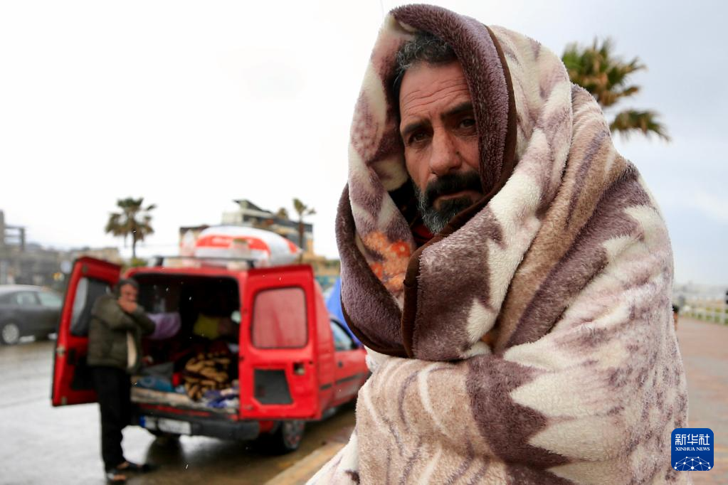 3月15日,在黎巴嫩南部赛达市附近的一条公路旁,一名黎巴嫩流离失所者用毯子御寒。