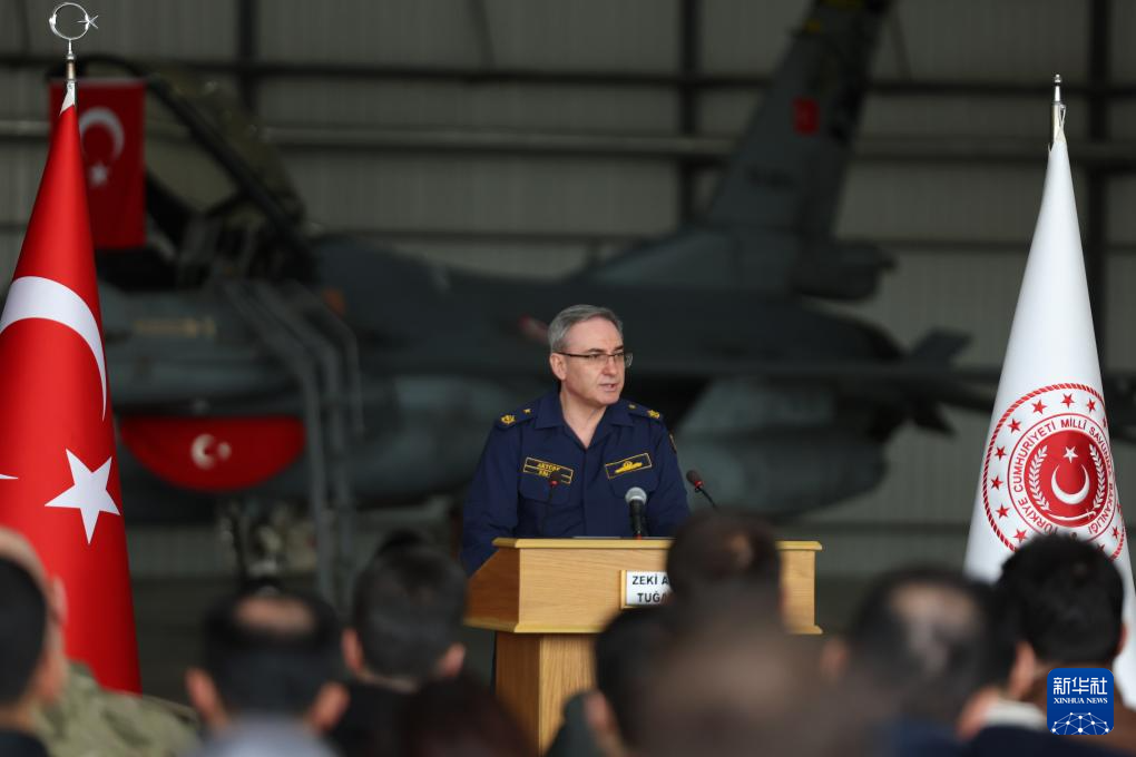 3月18日,土耳其国防部发言人泽基·阿克蒂尔克在位于该国东南部阿达纳省的因吉尔利克空军基地举行的记者会上讲话。