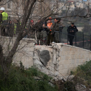 3月20日,在耶路撒冷老城附近,应急反应人员在一处被导弹碎片波及的地点开展工作。