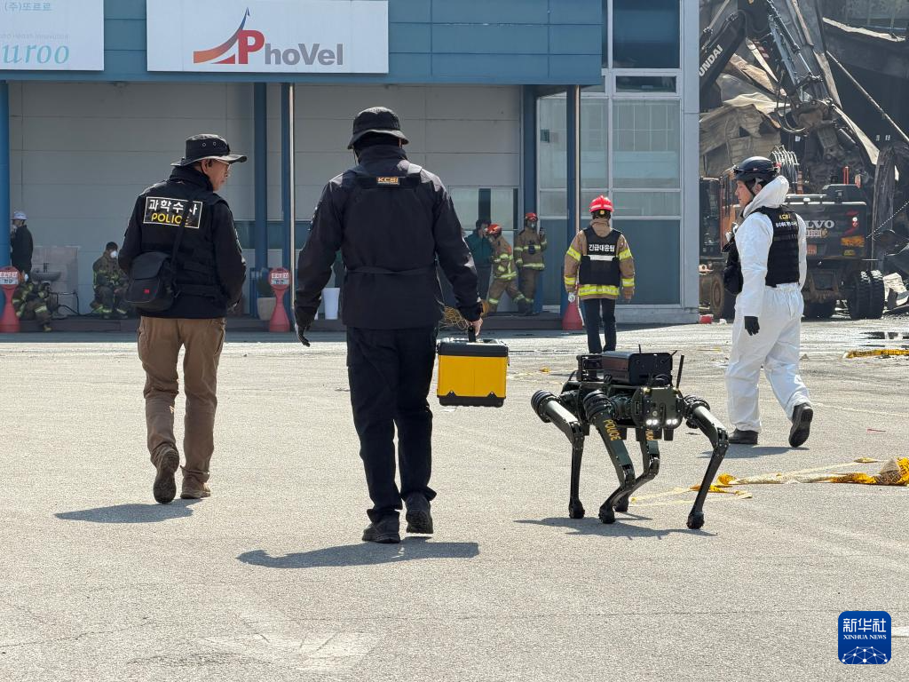 3月21日,救援人员和救援机器狗在韩国大田工厂火灾现场工作(手机照片)。