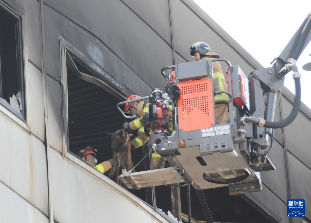 3月21日,救援人员将搜救犬送入韩国大田工厂火灾现场进行搜救。