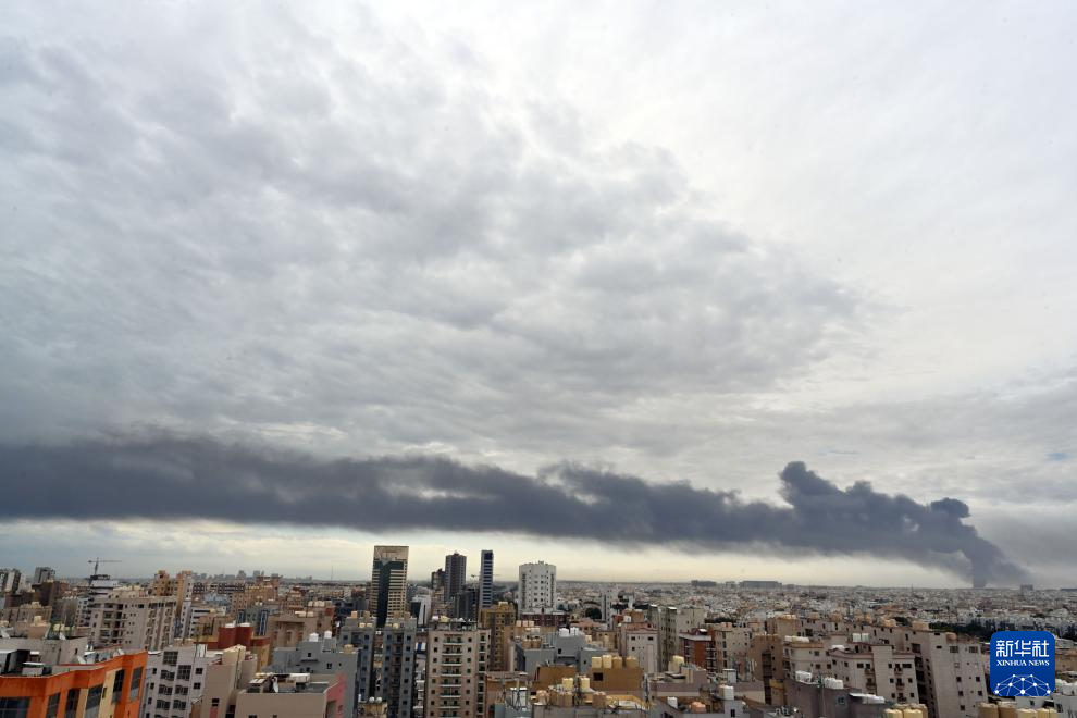 这张3月25日在科威特首都科威特城拍摄的照片显示,位于费尔瓦尼耶省的科威特国际机场一油库遭袭后冒起浓烟。