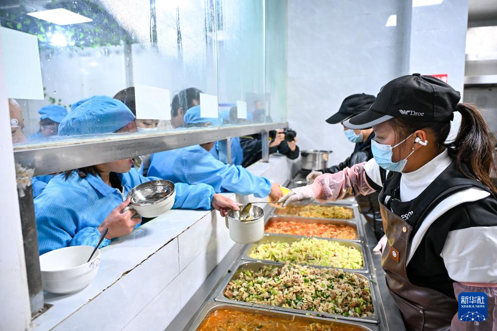 3月25日,以礼街道一家企业的工人在职工餐厅免费就餐。
