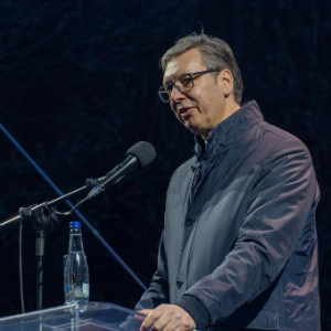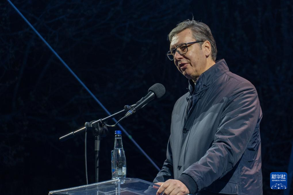 3月24日,塞尔维亚总统武契奇在弗拉涅举行的集会上发表讲话。