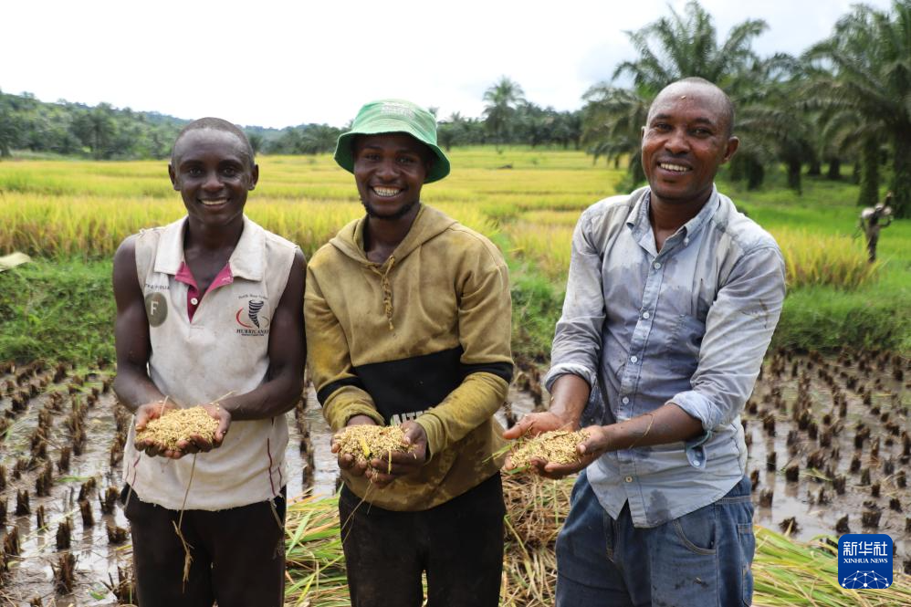 3月25日,在布隆迪布琼布拉省姆潘达县,当地农业技术员麦乐斯(右)与附近农户们手捧刚刚收获的稻粒。