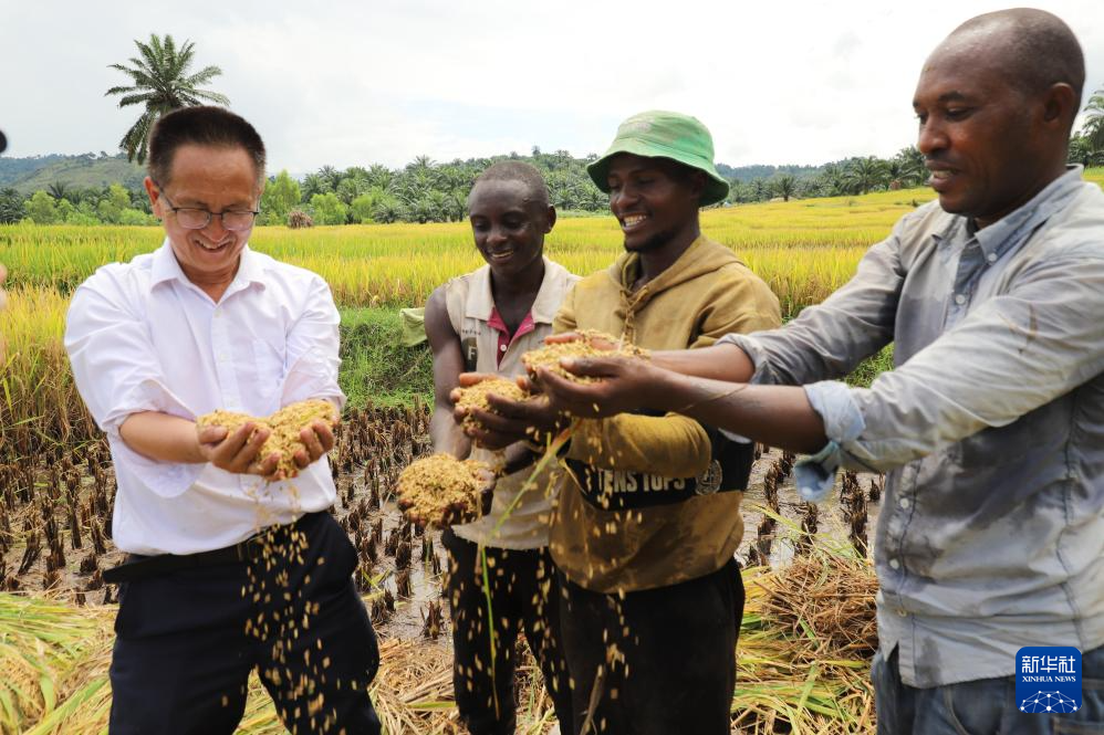 3月25日,在布隆迪布琼布拉省姆潘达县,中国援布农业专家组组长杨华德(左一)和当地农业技术员麦乐斯(右一)、附近农户们查看稻粒。