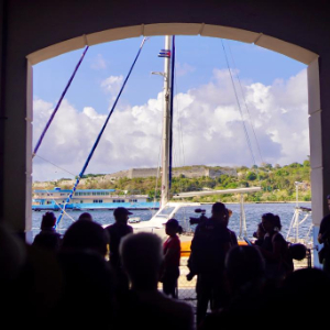 3月28日,在古巴首都哈瓦那,当地民众在码头欢迎运送人道主义援助物资的船只。