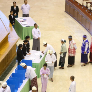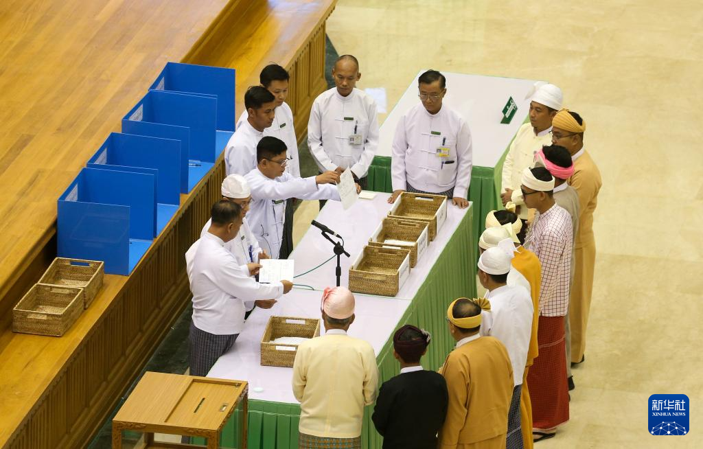 3月31日,在缅甸内比都,缅甸联邦议会人民院民选议员团成员在会议上投票选举副总统。