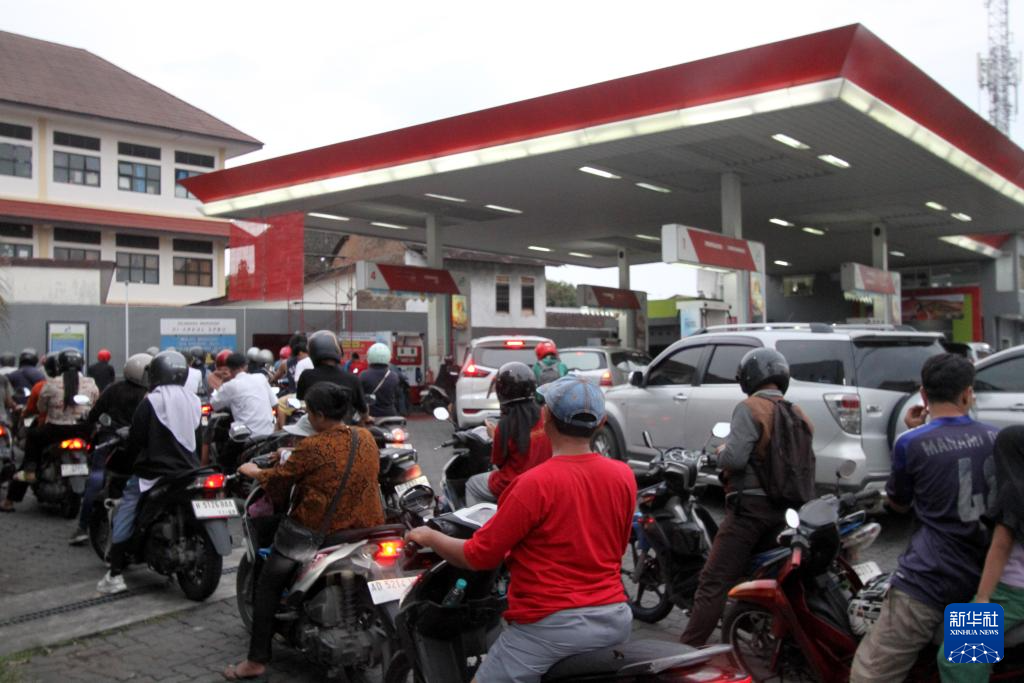 3月31日,人们在印度尼西亚梭罗一处加油站排队加油。