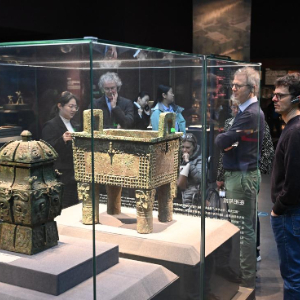 4月2日,参加中意文化遗产保护修复国际圆桌会议的意方专家在位于北京的中国考古博物馆参观馆藏文物。