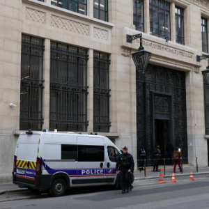 4月2日,在法国巴黎,警车停在美资银行门前。