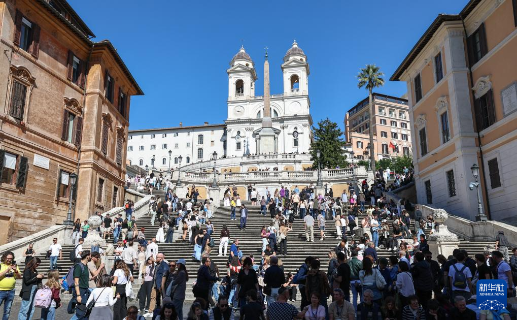 4月4日,游客在意大利首都罗马的西班牙广场参观游览。