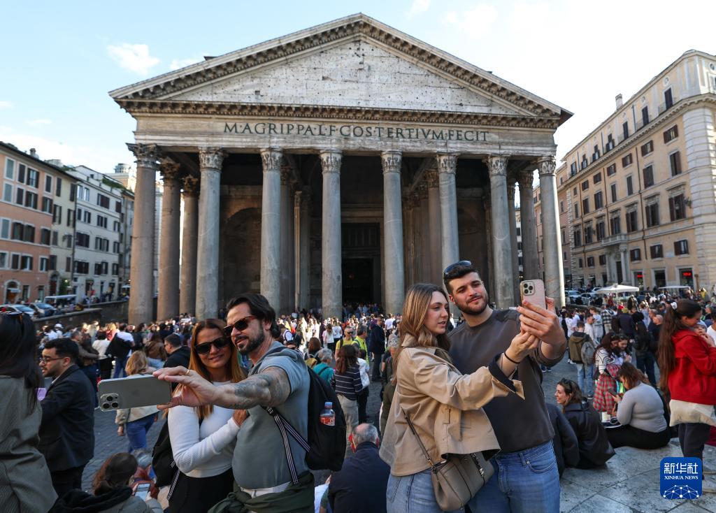 4月3日,游客在意大利首都罗马的万神殿前自拍合影。