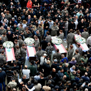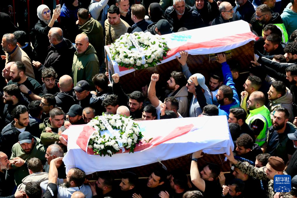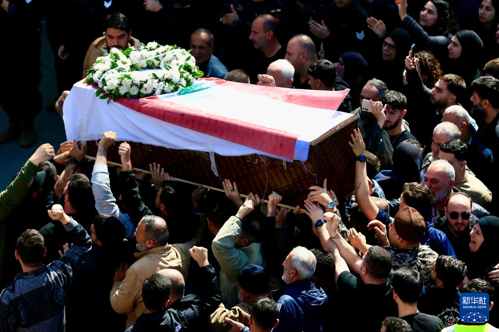 4月11日,在黎巴嫩西顿市,人们参加遭以军空袭丧生的13名安全人员的葬礼。