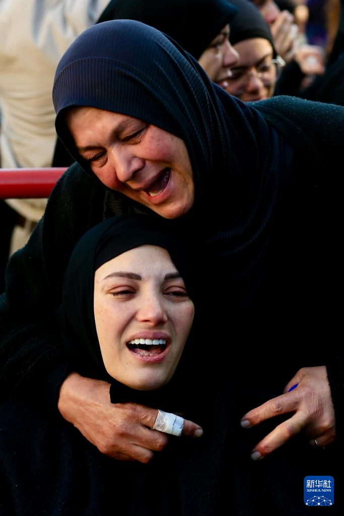 4月11日,在黎巴嫩西顿市,人们在遭以军空袭丧生的13名安全人员的葬礼上哭泣。
