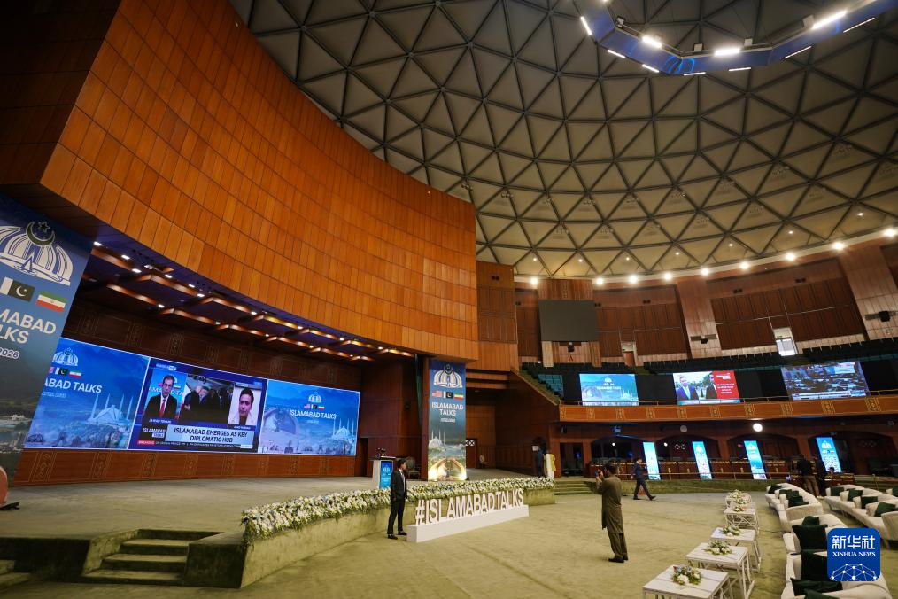 这是4月11日在巴基斯坦伊斯兰堡拍摄的美伊谈判新闻中心外景。