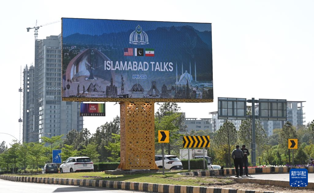这是4月10日在巴基斯坦伊斯兰堡拍摄的美伊会谈的大型户外广告牌。