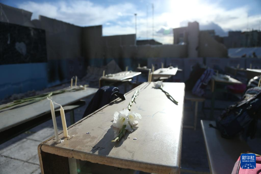 4月6日,在伊朗首都德黑兰市举行的悼念活动现场,组织者搭建起小学教室遭袭场景并在课桌上摆放鲜花,悼念遭美以空袭遇难的米纳卜小学学生。