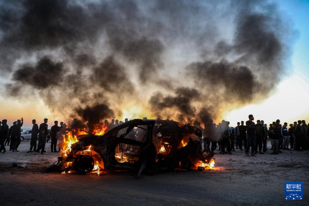 这是4月8日在加沙城拍摄的遭以军空袭后起火的车辆,车内一名半岛电视台记者遇难。