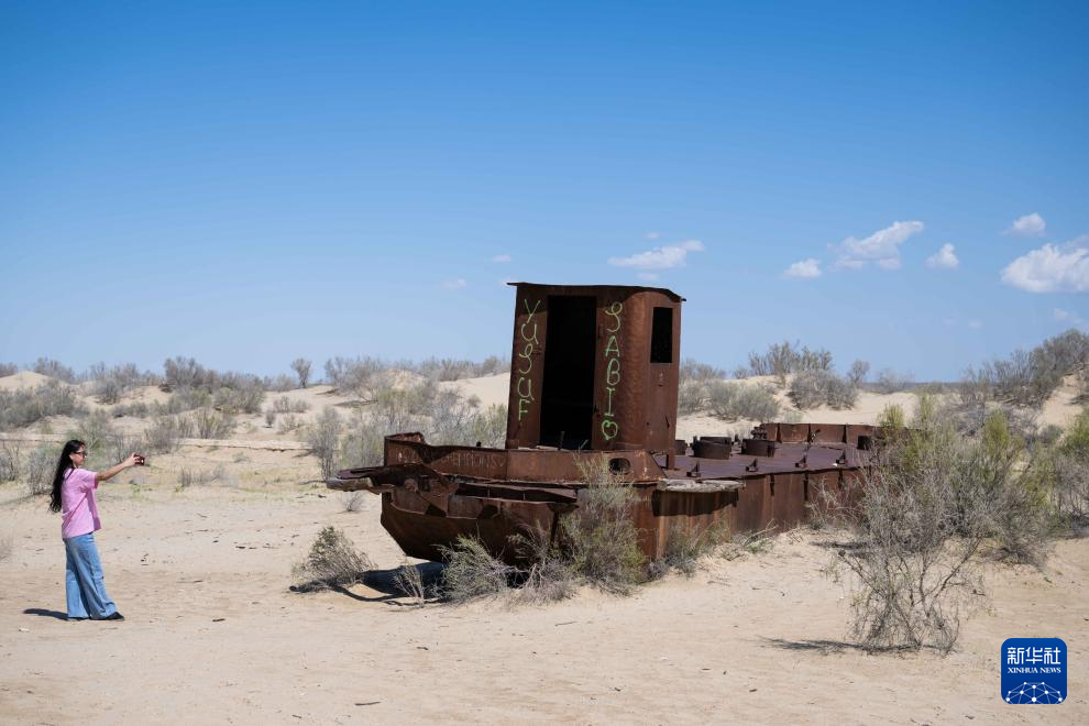 4月10日,在乌兹别克斯坦穆伊纳克,一名女子拍摄咸海“船舶公墓”。