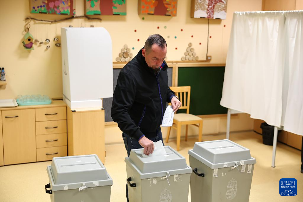 4月12日,在匈牙利首都布达佩斯,匈牙利蒂萨党领导人毛焦尔·彼得在一处投票站投票。