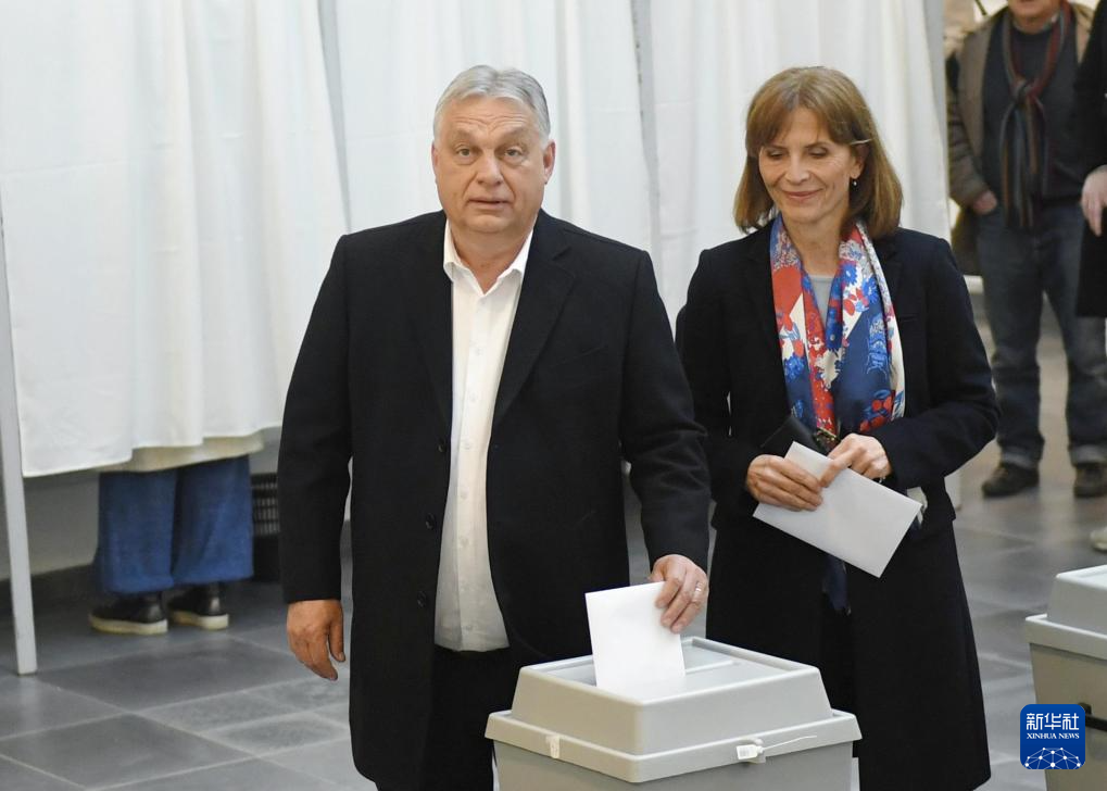 4月12日,在匈牙利首都布达佩斯,匈牙利总理欧尔班(左)和夫人在一处投票站投票。