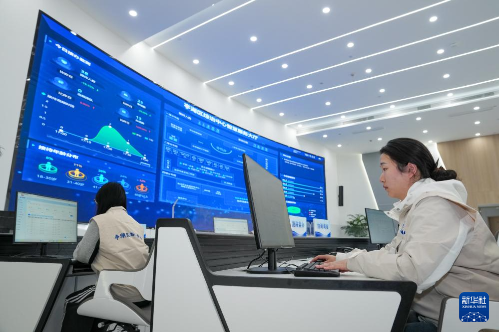 4月14日,工作人员在江苏省盐城市亭湖区综治中心依托一体化信息平台,开展指挥调度工作。