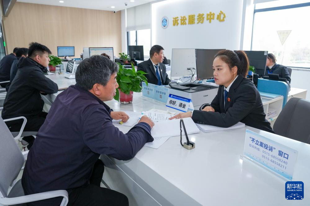 4月14日,工作人员在江苏省盐城市亭湖区综治中心为居民进行法律诉讼服务。