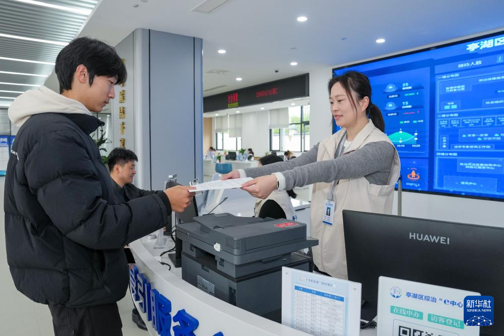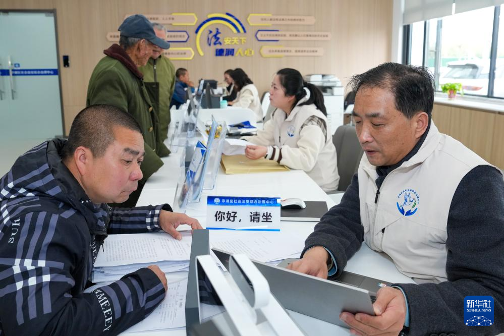 4月14日,工作人员在江苏省盐城市亭湖区综治中心为居民进行便民服务。