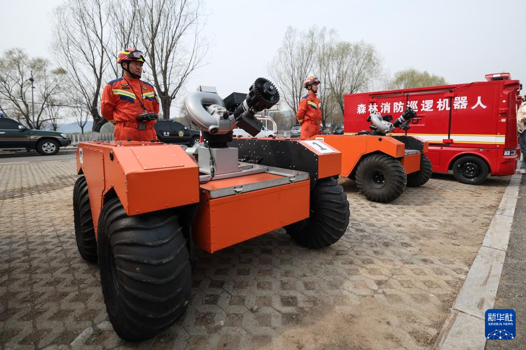 4月14日,森林消防人员在演练现场进行灭火演练。
