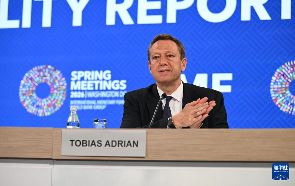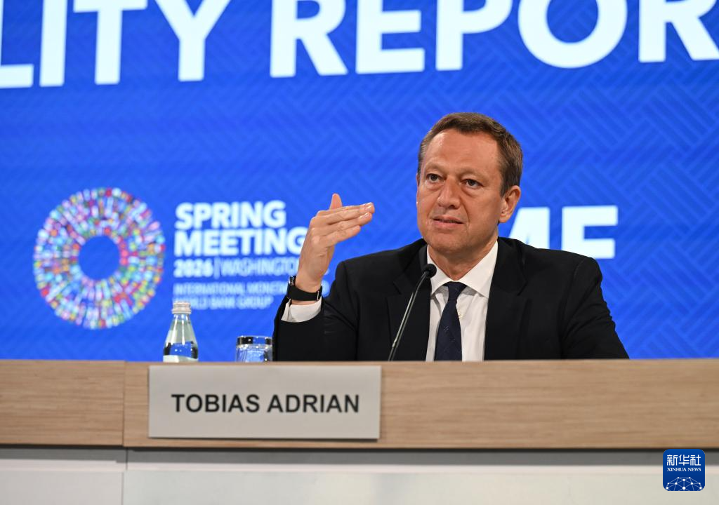 4月14日,在美国华盛顿,国际货币基金组织(IMF)货币与资本市场部主任托比亚斯·阿德里安(中)在《全球金融稳定报告》新闻发布会上讲话。
