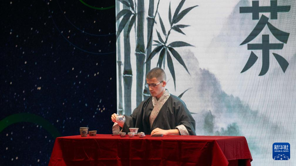 4月16日,在塞尔维亚尼什举行的中文大赛上,选手展示中国茶艺。