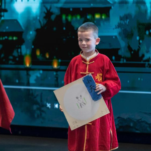 4月16日,在塞尔维亚尼什举行的中文大赛上,一名小选手展示自己的绘画作品。